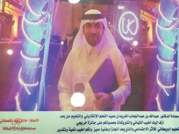 كرمت وكالة الدراسات والتطوير وخدمة المجتمع بجامعة الملك فيصل الدكتور عبدالله بن عبدالوهاب الفريدان خلال حفل عشاء ، الذي أقيم مساء الاربعاء ١٤/ ٦/ ١٤٣٨هـ في استراحة كتارا بالأحساء ، وذلك تكريماً لسعادته بمناسبة حصوله على جائزة خريجي التعليم البريطاني للأثر الاجتماعي ،