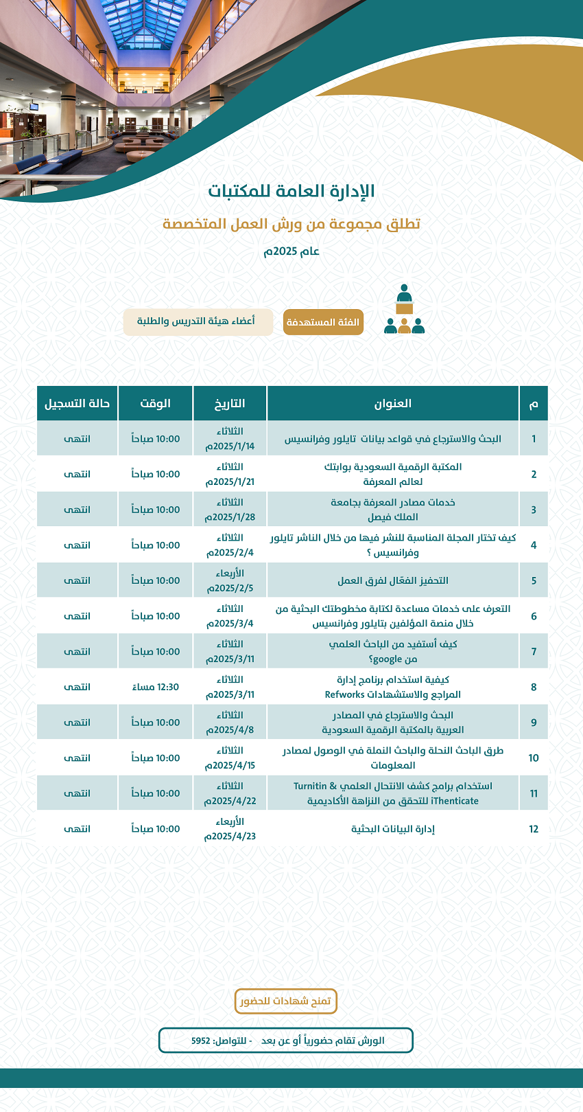 ورش الإدارة العامة للمكتبات للنصف الأول من عام 2025م