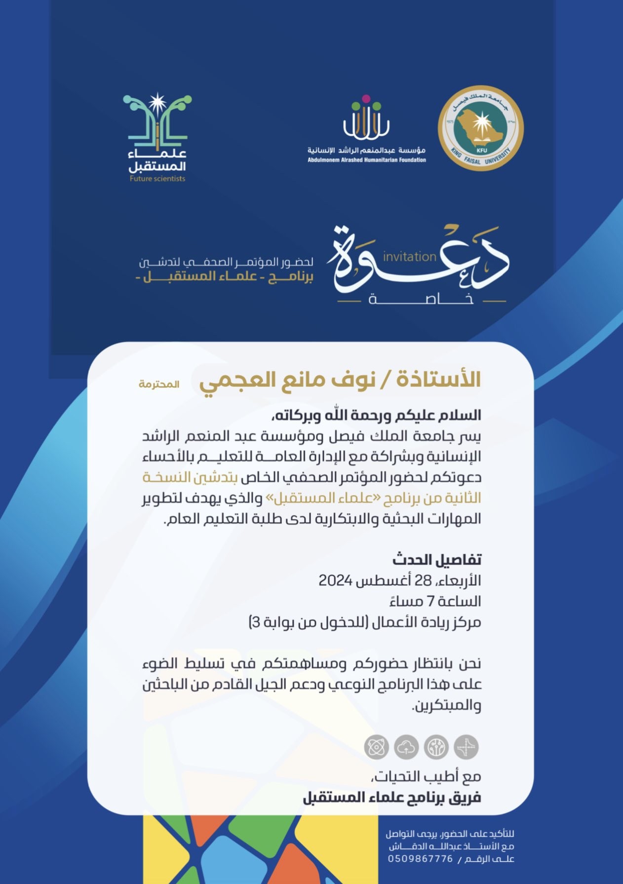 بدعم من مؤسسة عبدالمنعم الراشد الإنسانية يعتبر برنامج علماء المستقبل برنامجا تدريبيا متكاملا يعنى بتأهيل عدد من الطلبة الموهبين في مرحلة التعليم الثانوي للبحث العلمي وتهيئتهم للتقدم لأفضل الجامعات العالمية المرموقة حسب التصنيفات العالمية في اطار رؤية المملكة 2030.