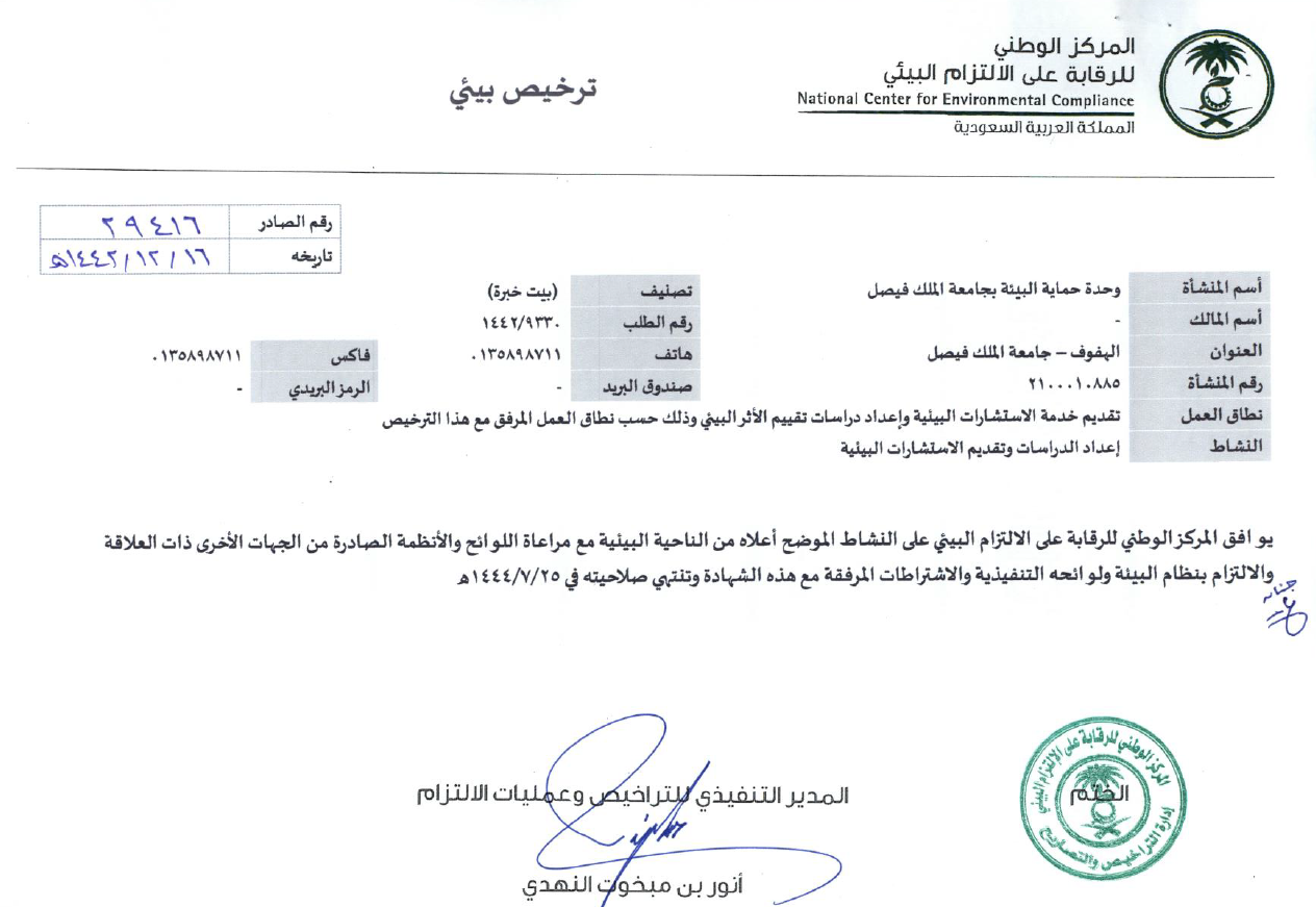 قامت جامعة الملك فيصل بعقد مجموعة من الاتفاقيات التي تعنى بحماية النظم البيئية المائية وتنوعها البيولوجي ومن أبرزها التعاون مع شركة القصيبي في مشروع لتطوير تقنيات صديقة للبيئة تسهم في الحد من الانبعاثات المؤثرة على الحياة البحرية . وكذلك توقيع مذكرة تفاهم مع وزارة البيئة والمياه والزراعة لمراقبة جودة المياه وتعزيز الابتكار البيئي في القطاع الصناعي
