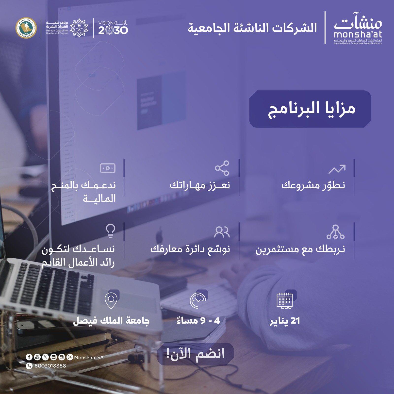 ويهدف برنامج مسرعات أعمال المشاريع الناشئة الجامعية إلى دعم المشاريع الريـادية لمنسوبي وطلبة الجامعات وحديثي التخرج، وتنمية قدراتها وتعزيز نموها في السـوق وتحسيـــن جاذبيتها لاستقطـــاب رأس المـــال المستثمـــر، وتحسيــن بنيتهـا التنظيميـــة وقدرتها التنافسيـــة؛ لتصبح شركــات ناشئة نــاجحة جاذبة للفــرص الاستثمارية، وقــادرة على النمو والتوسع والاستدامة
