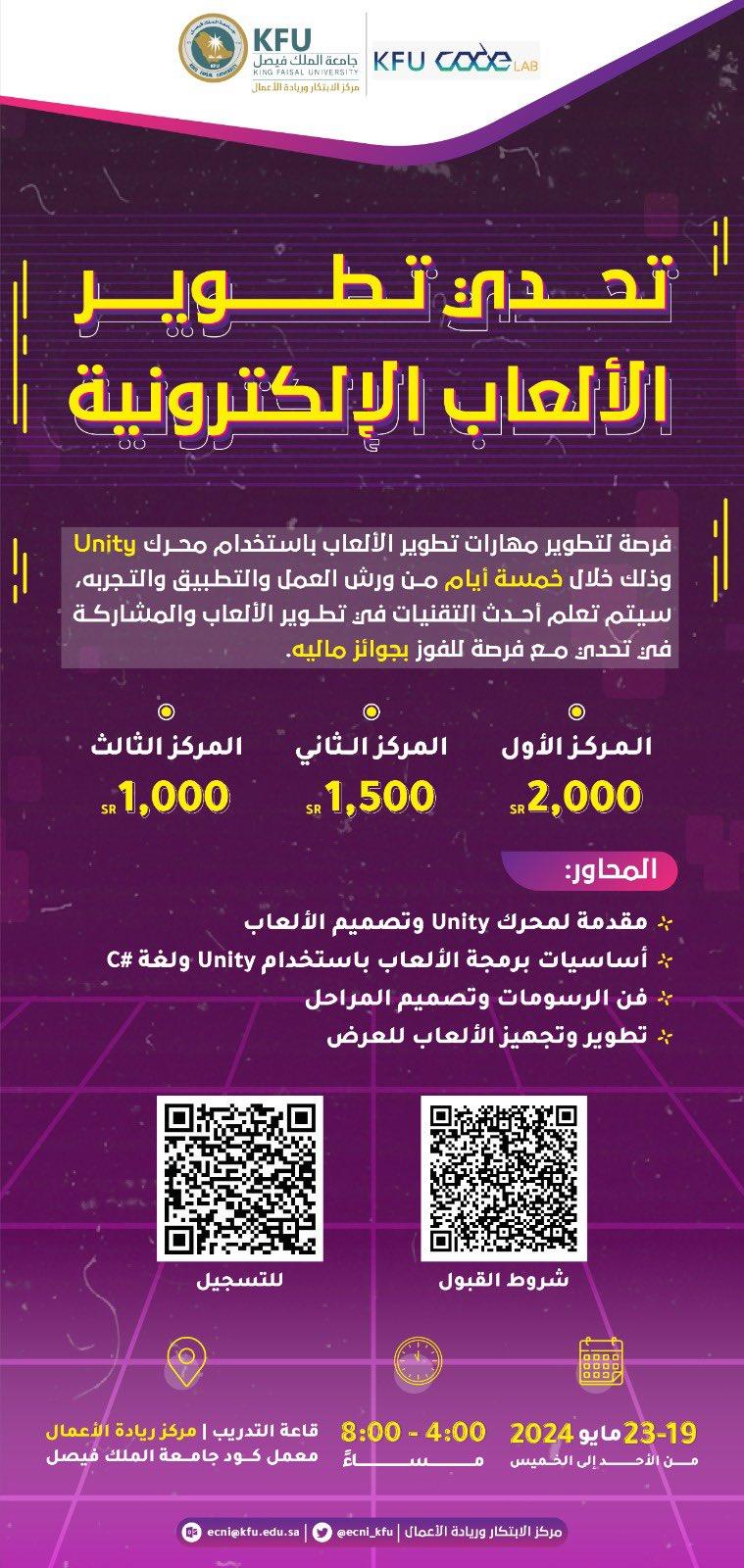 بالتعاون مع معمل كود قامت جامعة الملك فيصل بإعداد مسابقة "تحدي تطوير الألعاب الإلكترونيه" المقامه في مقر مركز ريادة الأعمال مع تكريم الثلاثة الأوائل بمبالغ مالية دعماً لتطوير مهارات تطوير الألعاب الالكترونية