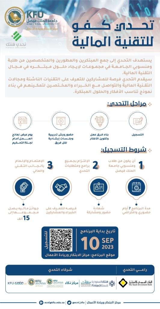 تحدي كفو للتقنية المالية يهدف إلى جمع المبتكرين والمطورين والمتخصصين للعمل في مجموعات لإيجاد حلول مبتكرة في مجال التقنية المالية حيث أن التحدي مقدم برعاية من البنك السعودي للاستثمار وبالتعاون مع فنتك السعودية ومركز الذكاء ومعمل كود جامعة الملك فيصل وكلية إدارة الأعمال وكلية الحاسب وتقنية المعلومات. كما يهدف إلى خلق حلول مبتكرة وجديدة تساعد على حل التحديات وتطوير الخدمات في القطاع المالي وتكريم الفائزين فيه وتبني المشاريع المبتكرة فيه